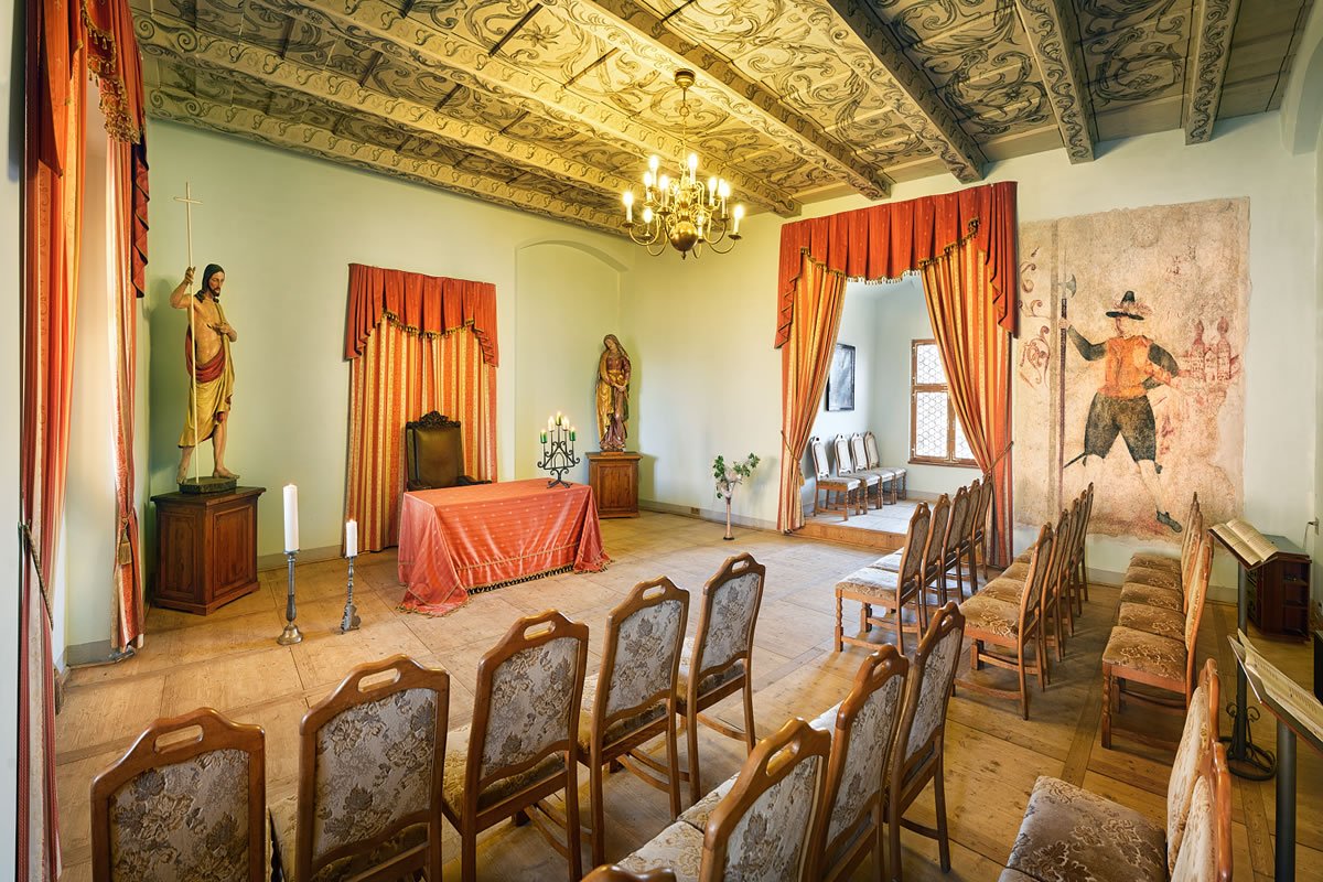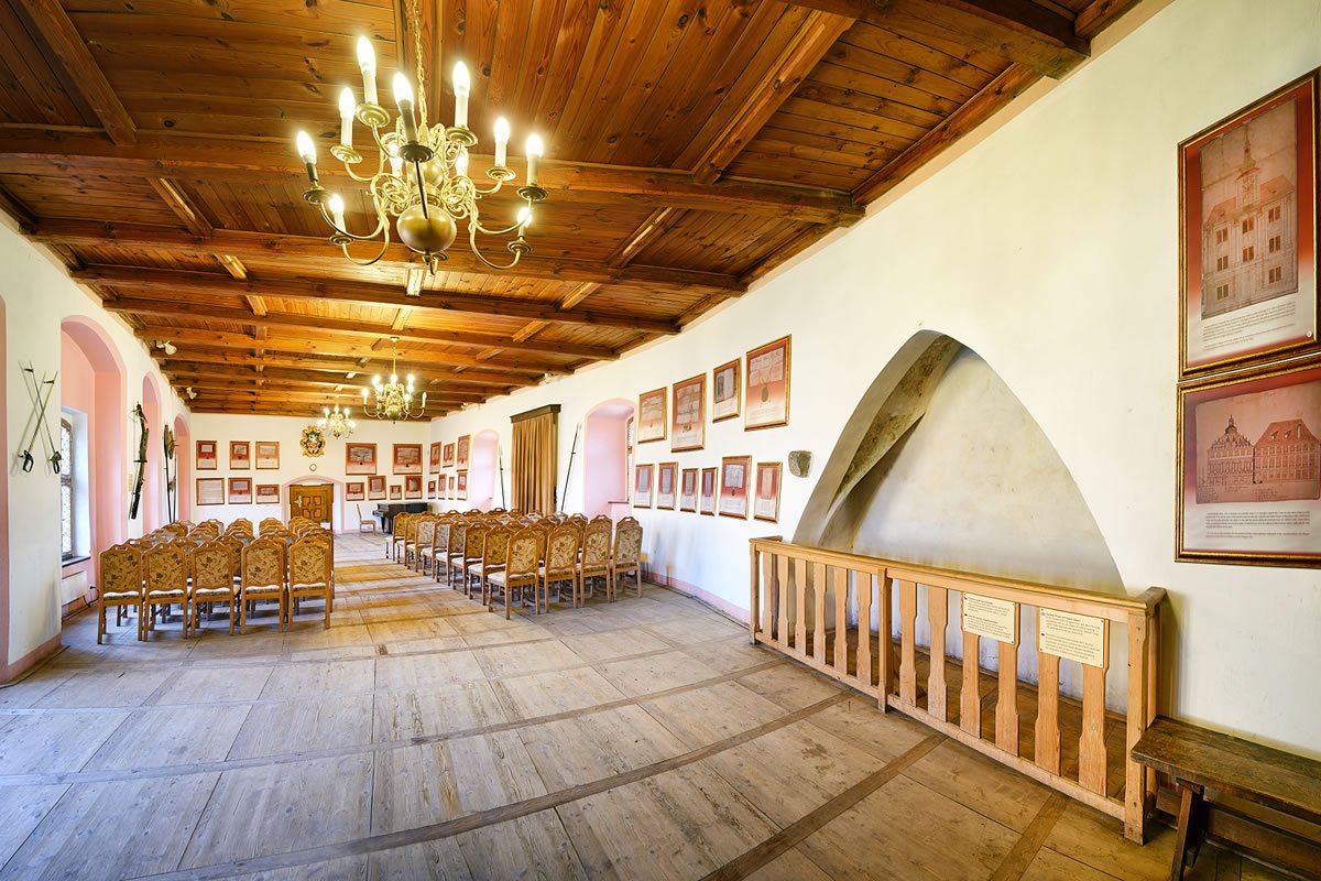 Der Saal im ersten Stock des Gebäudes beherbergt eines der Juwelen der Burg: Wandmalereien aus dem frühen 15. Jahrhundert. Im Stockwerk des östlichen Flügels der Burg befindet sich ein Festsaal, der häufig für musikalische und theatralische Veranstaltungen sowie mittelalterliche und Hochzeitsbankette genutzt wird. Vom Saal führt eine Treppe in den Zeremoniensaal, der mit einem großen Fresko aus dem 17. Jahrhundert dekoriert ist. Sowohl der Festsaal als auch der Zeremoniensaal können gemietet werden.