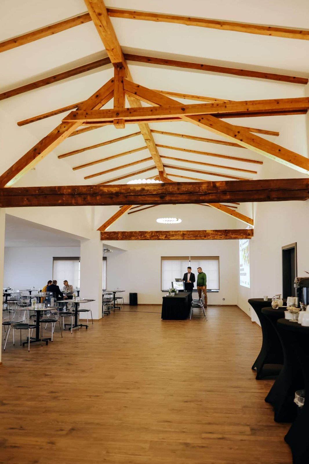 Im obersten Stockwerk liegt eine kleinere Halle, ideal für Trauungen, Konferenzen, Schulungen und Teambuilding. Der Raum mit 160 m² und originalen massiven Holzbalken bietet Platz für bis zu 100 sitzende Gäste.