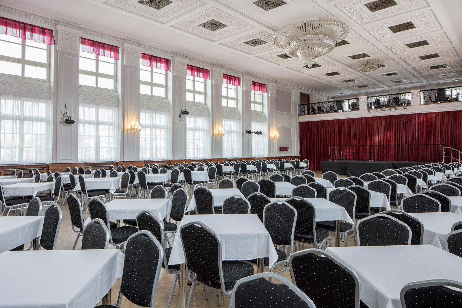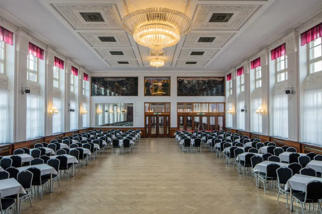 At the House of Culture Ostrov it is possible to organise balls and gala evenings; there is also a recording studio, rehearsal rooms and a shared photo studio. On the ground floor, behind the entrance hall, there is a theatre hall which also serves as a permanent cinema. From the entrance hall two staircases lead to the first floor, where there is a foyer with a loggia; on both sides there are the small and the large hall. In front of the House of Culture is the large Mírové Square, which can be used for your events and activities with the permission of the municipal office. The House of Culture offers assistance in organising events, providing necessary contacts and lending equipment and instruments.